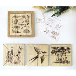 Cada puzzle é cuidadosamente embalado num saquinho de pano de algodão, e vem acompanhado de uma pequena folha de instruções.