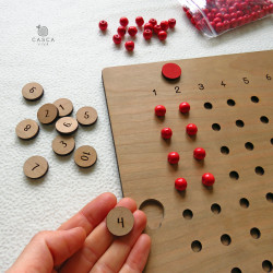 - 10 peças redondas com algarismos 1 a 10 e uma peça vermelha para indicação dos factores de multiplicação