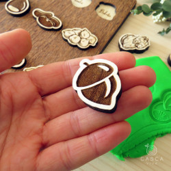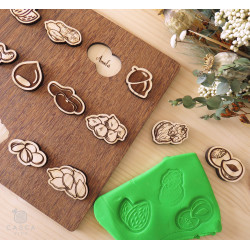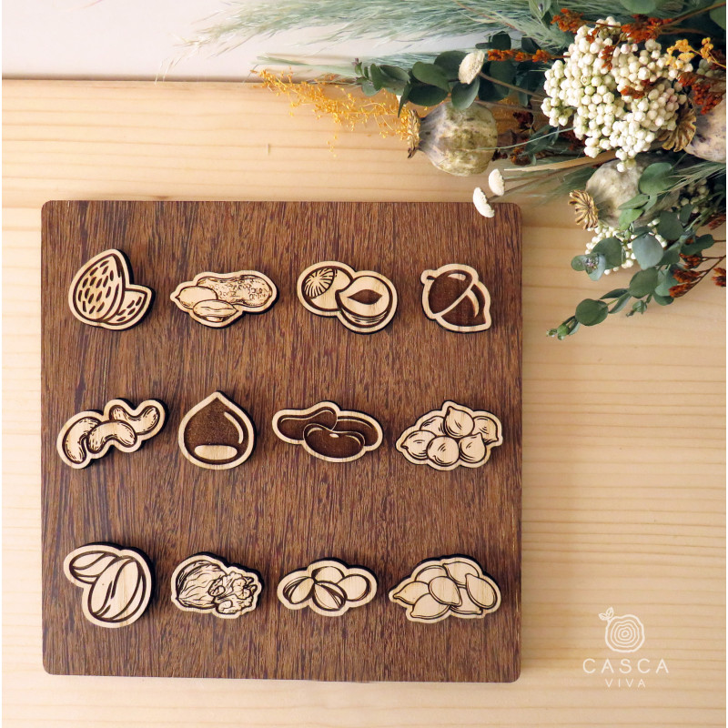 Puzzle em madeira com formatos de sementes para encaixe, com os respectivos nomes.